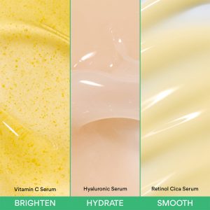 Find your skincare bestie with our Dewy Skin Serum Discovery Trio . Address all your concerns with our targeted solutions: full size vitamin C for brightening. mini Hyaluronic Acid for hydration. and mini Retinol for skin smoothing. Trial these targeted serums to find your perfect match for a radiant. youthful complexion!