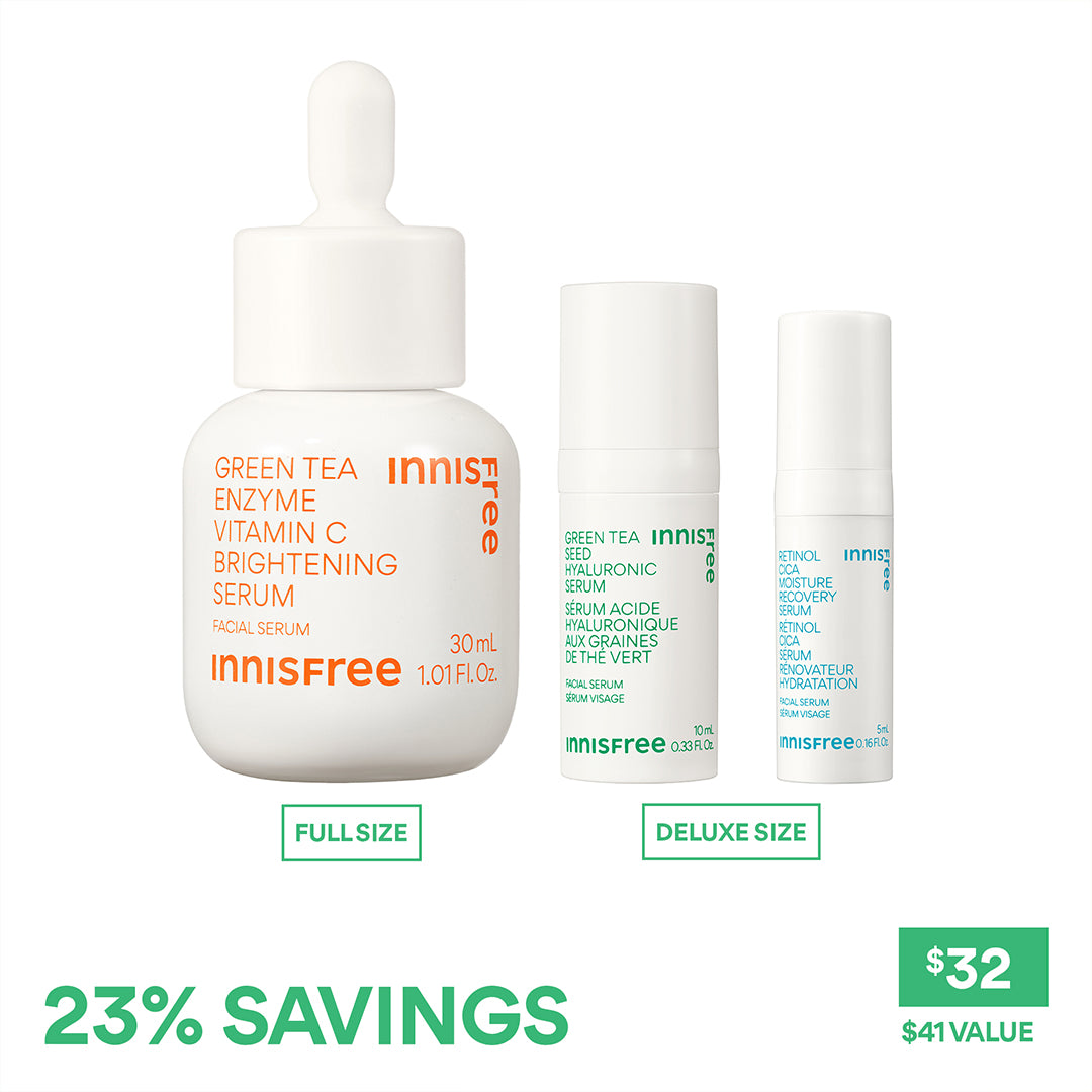 Find your skincare bestie with our Dewy Skin Serum Discovery Trio . Address all your concerns with our targeted solutions: full size vitamin C for brightening. mini Hyaluronic Acid for hydration. and mini Retinol for skin smoothing. Trial these targeted serums to find your perfect match for a radiant. youthful complexion!