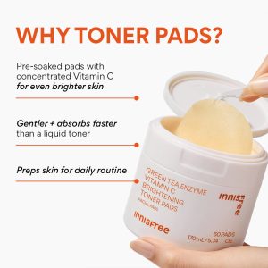 Biodegradable. daily toner pads concentrated with Vitamin C + Green Tea Enzyme to help brighten skin & fade dark spots like post-breakout marks + sun spots.