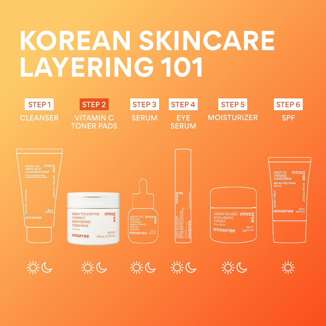Biodegradable. daily toner pads concentrated with Vitamin C + Green Tea Enzyme to help brighten skin & fade dark spots like post-breakout marks + sun spots.