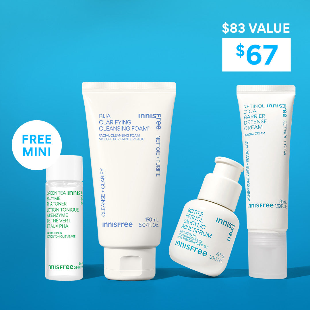Say hello to your new routine to target acne and soothe troubled skin. This routine set features full sizes of our Bija Clarifying Cleanser. Gentle Retinol Acne Serum. and Retinol Cica Barrier Defense Cream??plus a free deluxe Green Tea Enzyme PHA Toner to help smooth your skin. Clear + soothed skin? Coming right up.